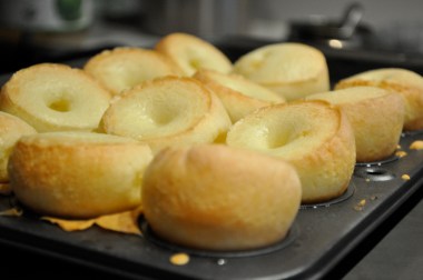 3. Place cookie sheet with muffin tin into the oven and bake until puffed and golden, about 20 minutes. Eat while warm or reheat later.