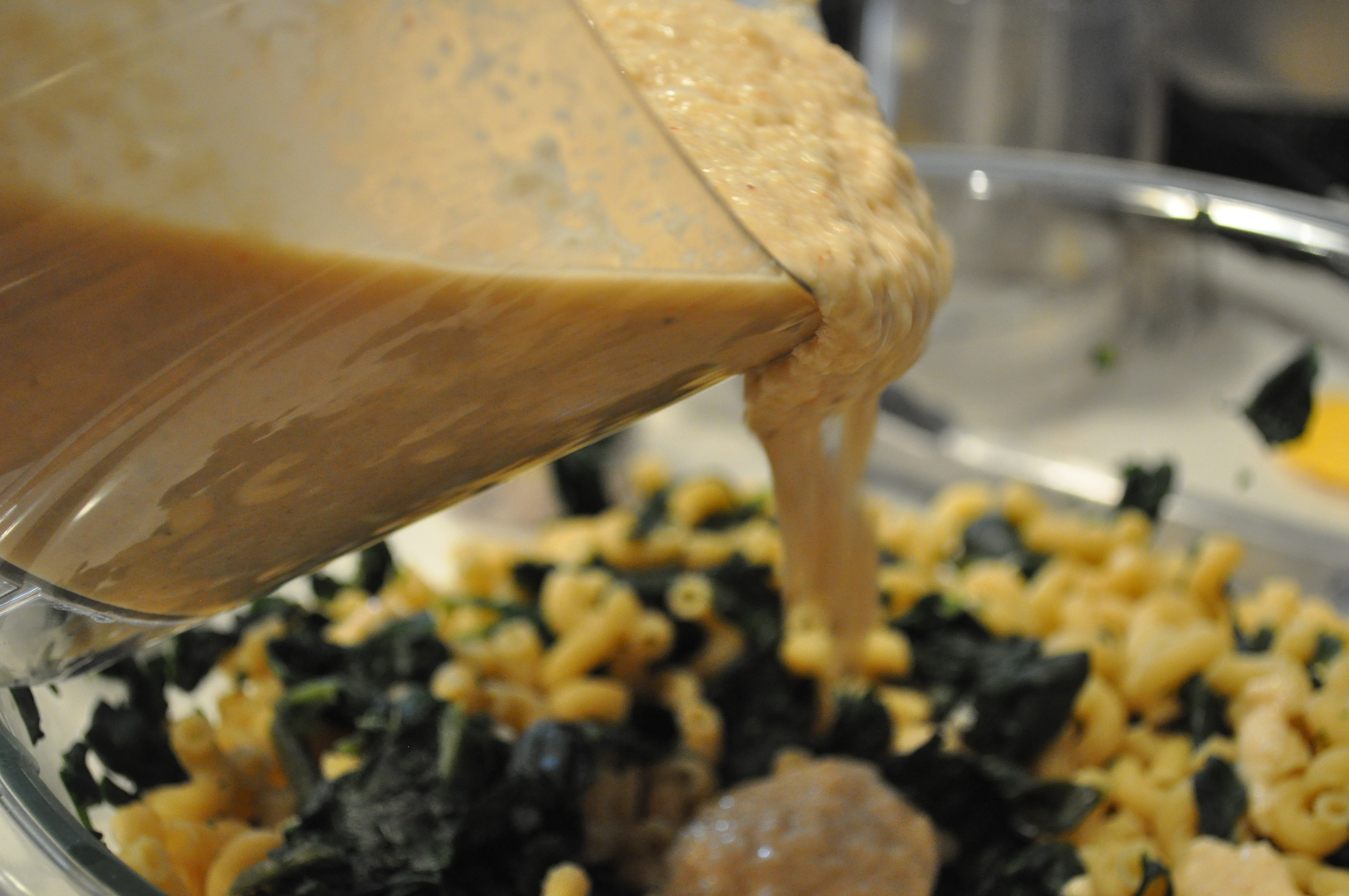 3.  Grind cashews in food processor. Add 1 cup of water and blend. Add cooked onions, white beans, miso paste, remaining 3/4 cup water, lemon juice, dried mustard, cayenne, nutmeg, garlic powder and salt.  Blend again until smooth.  Taste and adjust the spices as necessary.  Pour bean/cashew sauce over the cooked macaroni and spinach.  Mix until well combined.