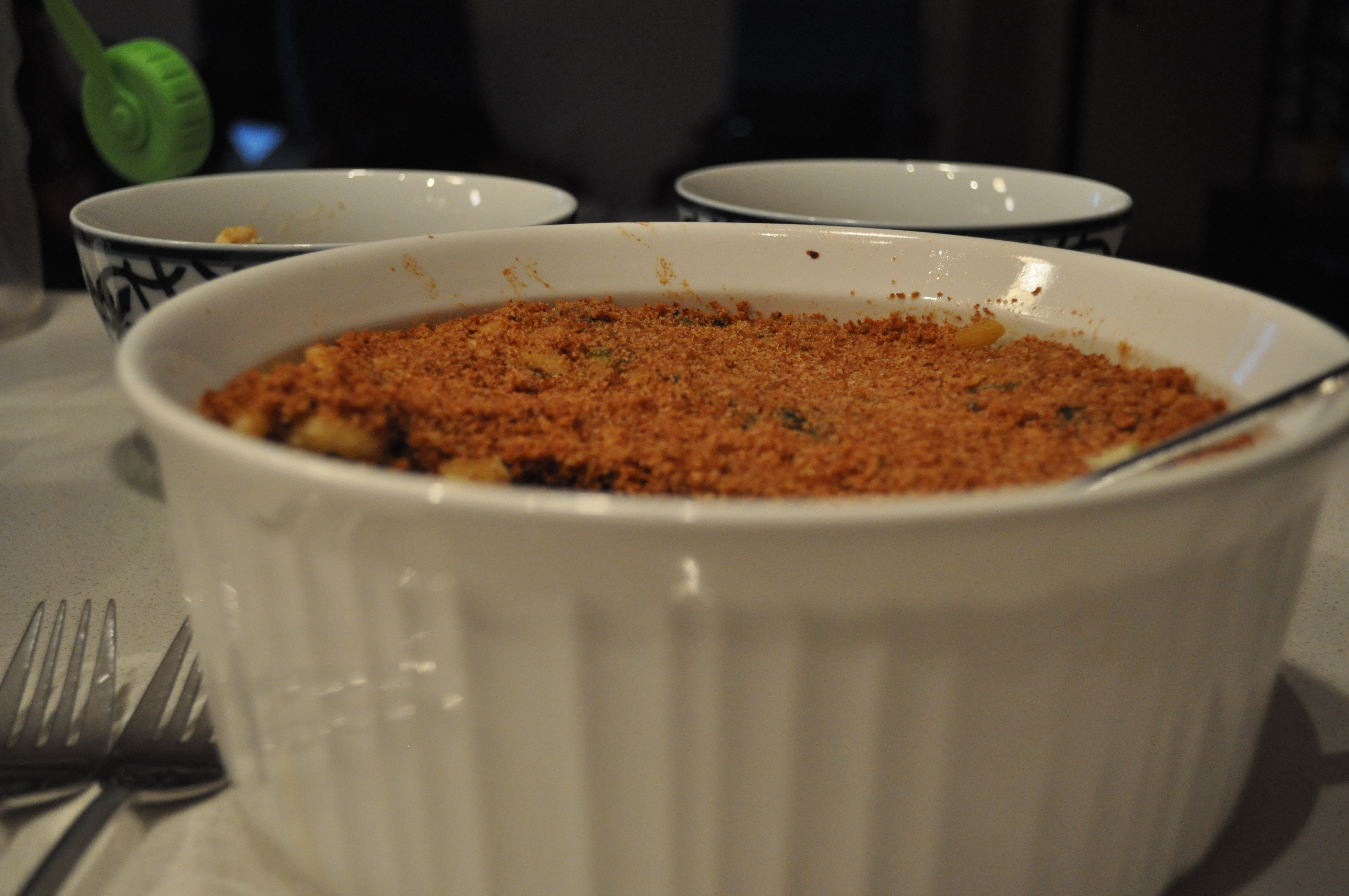 5.  Melt butter in a pan, over medium-low heat.  Add breadcrumbs and toast until browned and fragrant.  Spread on top of casserole.  Bake for 30 minutes until brown and bubbly.  Let sit for 5 minutes before digging in.