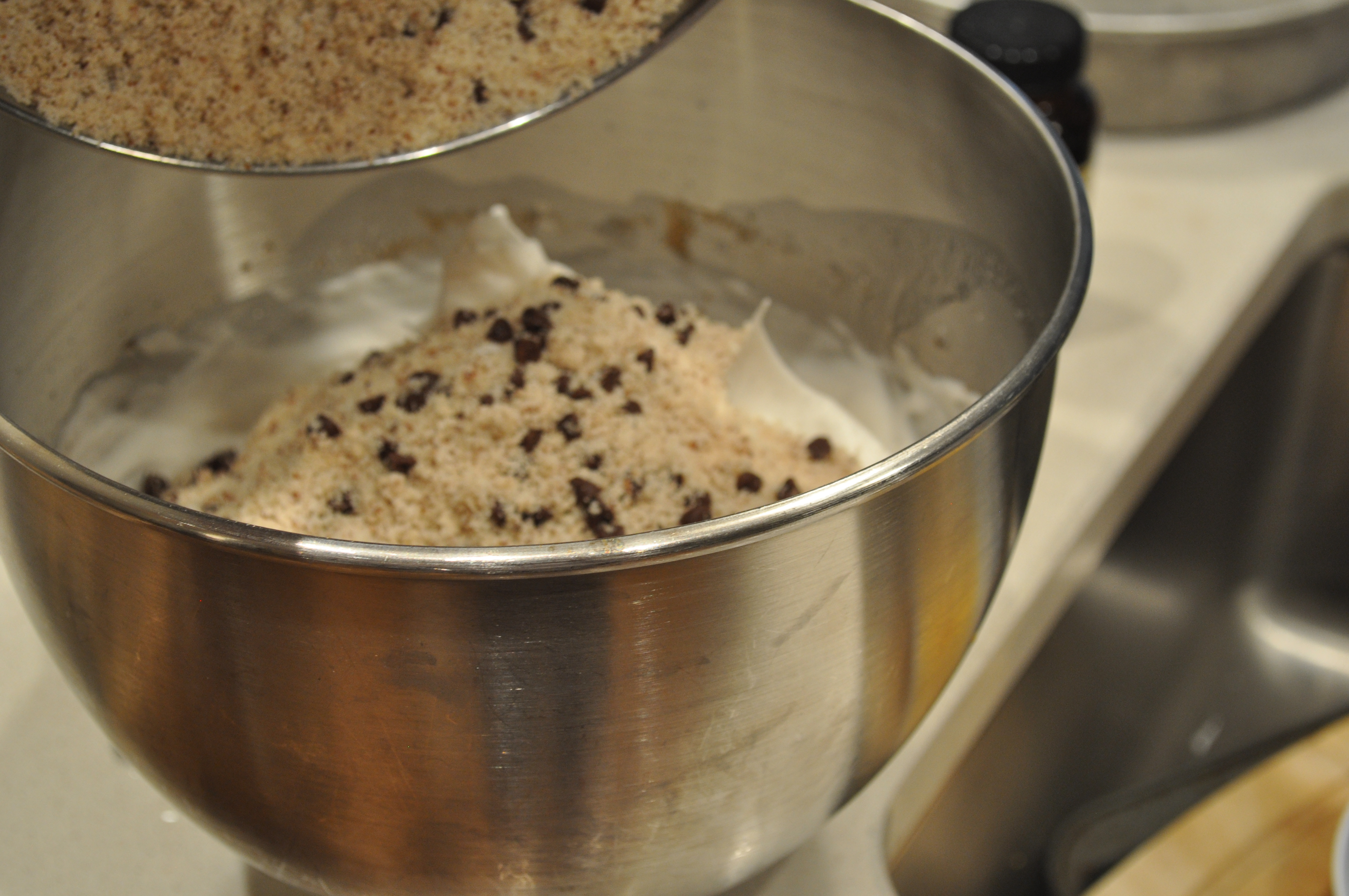 In a bowl, mix together the almonds, sugar and salt. With a mixer, whip egg whites until soft peaks form. With the mixer running, slowly add in the vanilla and remaining 3 tablespoons of sugar. Beat until the egg whites are stiff but not dry. Gently fold in the egg white mixture into the almond mixture until well combined. Add mini chocolate chips and stir. Divide evenly among the two pans, spreading to make sure that it covers all sides.
