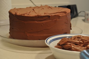 Considering how impressive this cake looks, it was surprisingly easy to put together. It was frosted, and ready to be eaten all in a morning’s time. I love the chocolate orange combo, and so does my sister (and so does Michael Jackson, we’d like to believe), but the fruit/chocolate combo is obviously endless. Or you can make it pure chocolate. I have to say that the chocolate was a bit too much for me (but I’m a cinnamon and fruit flavored dessert girl, after all), so next time I would probably omit the chocolate chips from the macaron layers. The aforementioned tall thing is pretty important considering serving sizes – with this four layer cake, we were able to feed about 40 people with satisfying slices.