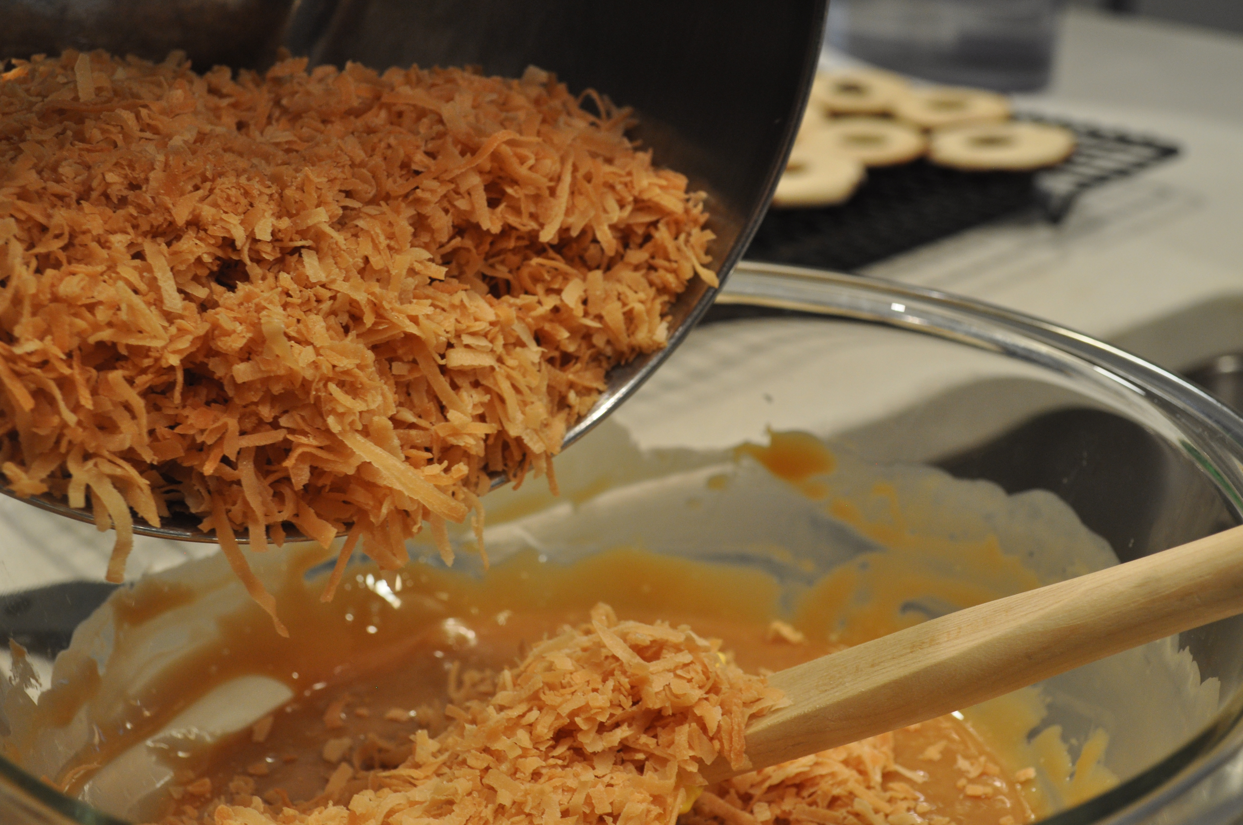 1. Preheat oven to 300 degrees. Spread coconut evenly on a parchment-lined baking sheet (preferably one with sides) and toast 40 minutes, stirring every 5 minutes, until coconut is golden. Cool on baking sheet, stirring occasionally. Set aside.