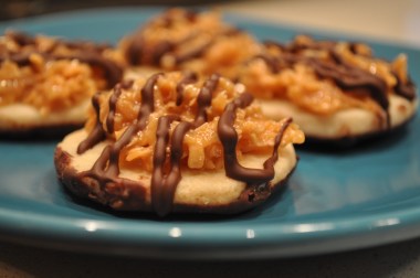 3. While the chocolate on the cookies is setting up, melt the unwrapped caramel candies in a double boiler with the cream and salt. Heat until it has become a smooth sauce. Add the toasted coconut and stir well. Place about a tablespoon of the coconut mixture on top of the cooled cookies (chocolate side down).