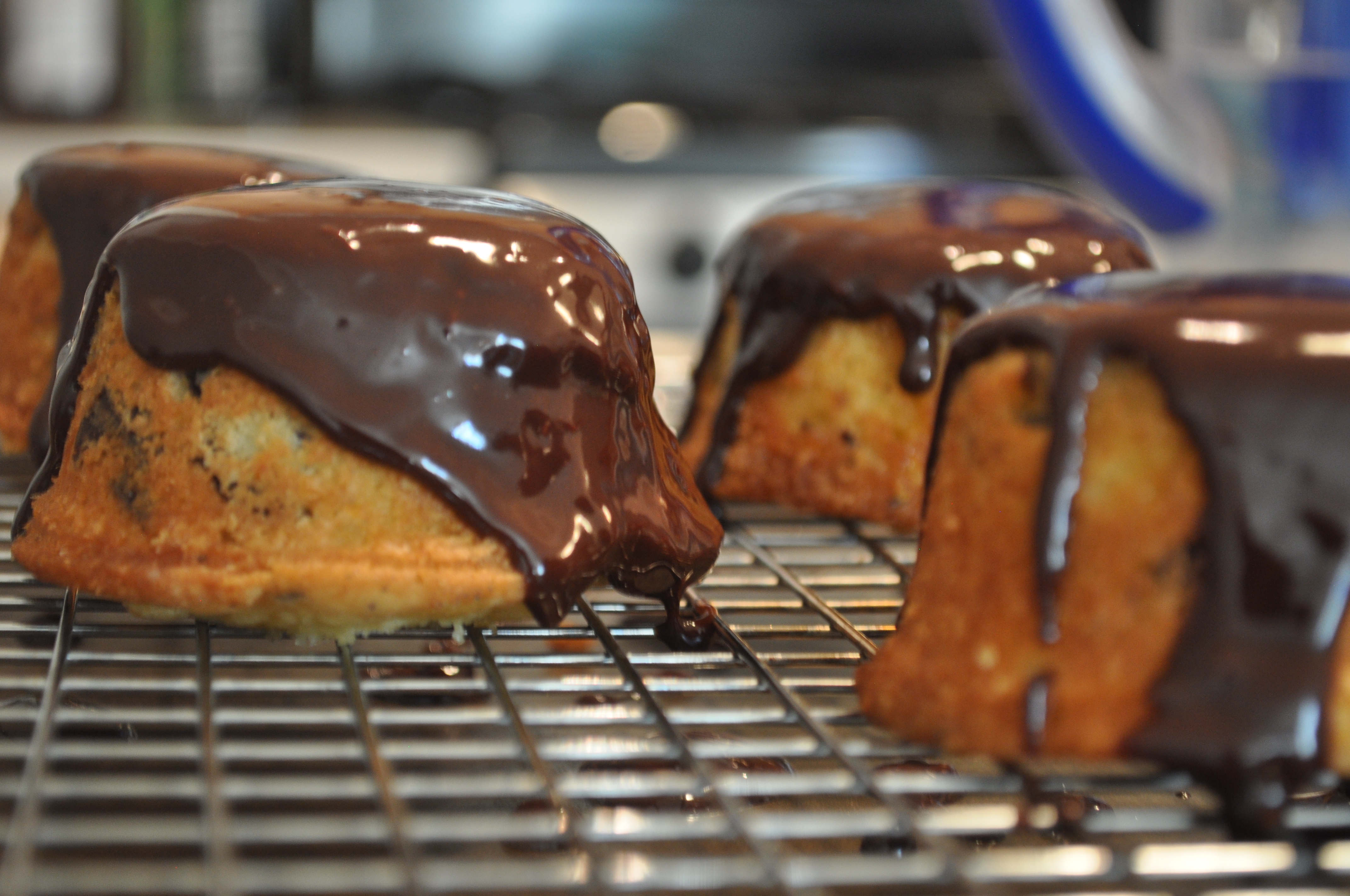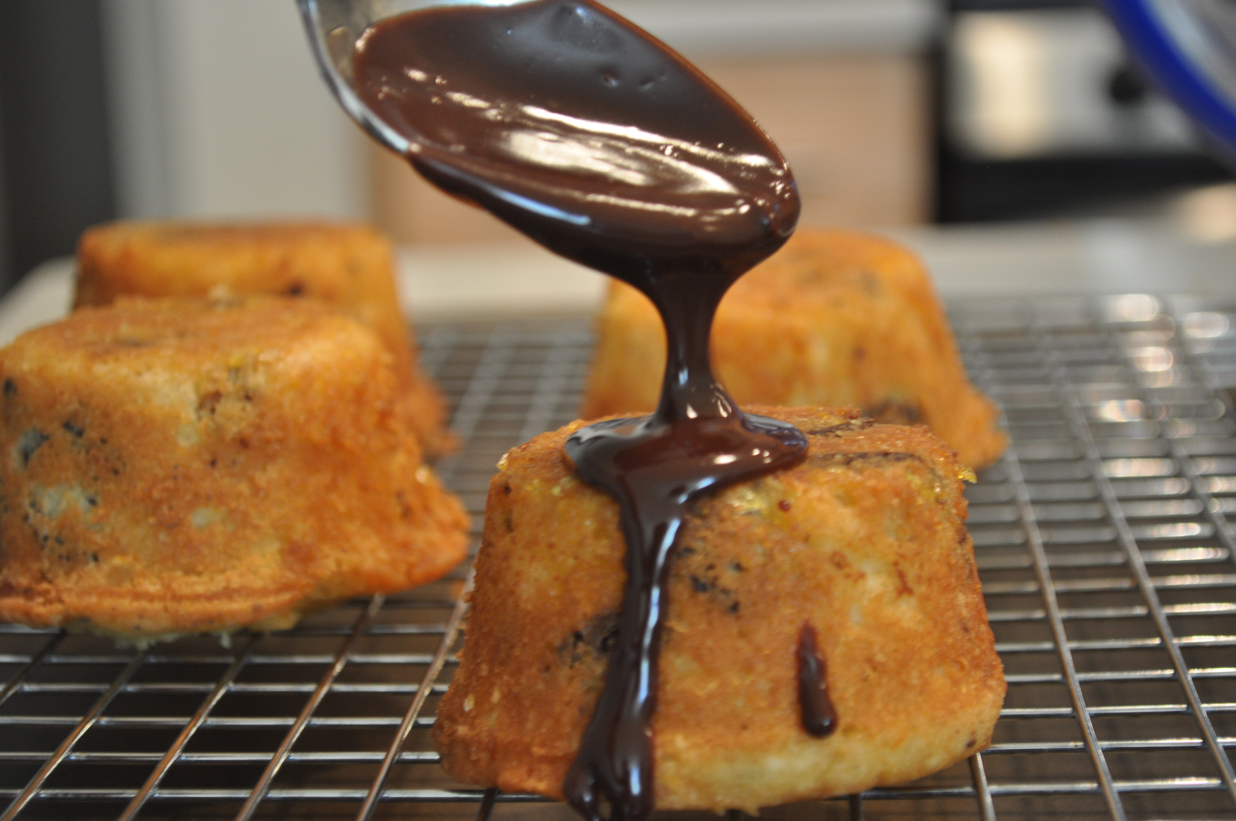 For the ganache, melt the chocolate, cream, and coffee in the microwave, in 30 second intervals, or in a double boiler over simmering water until smooth and warm, stirring occasionally. Spoon over the top of the cakes.