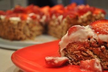 With a mixer, on low speed, beat the egg whites until foamy. Add cream of tartar and salt, and turn the mixer on medium high until soft peaks begin to form. Gradually add the sugar slowly, then the vanilla, and mix at high speed until stiff peaks form. Gently fold in the pecans and graham crackers. Pour into the prepared pan. Bake for about 30 minutes, or until just lightly golden on top. Cool for about 15 minutes, and then release the springform pan. Spread on the cream cheese frosting and decorate with strawberries.