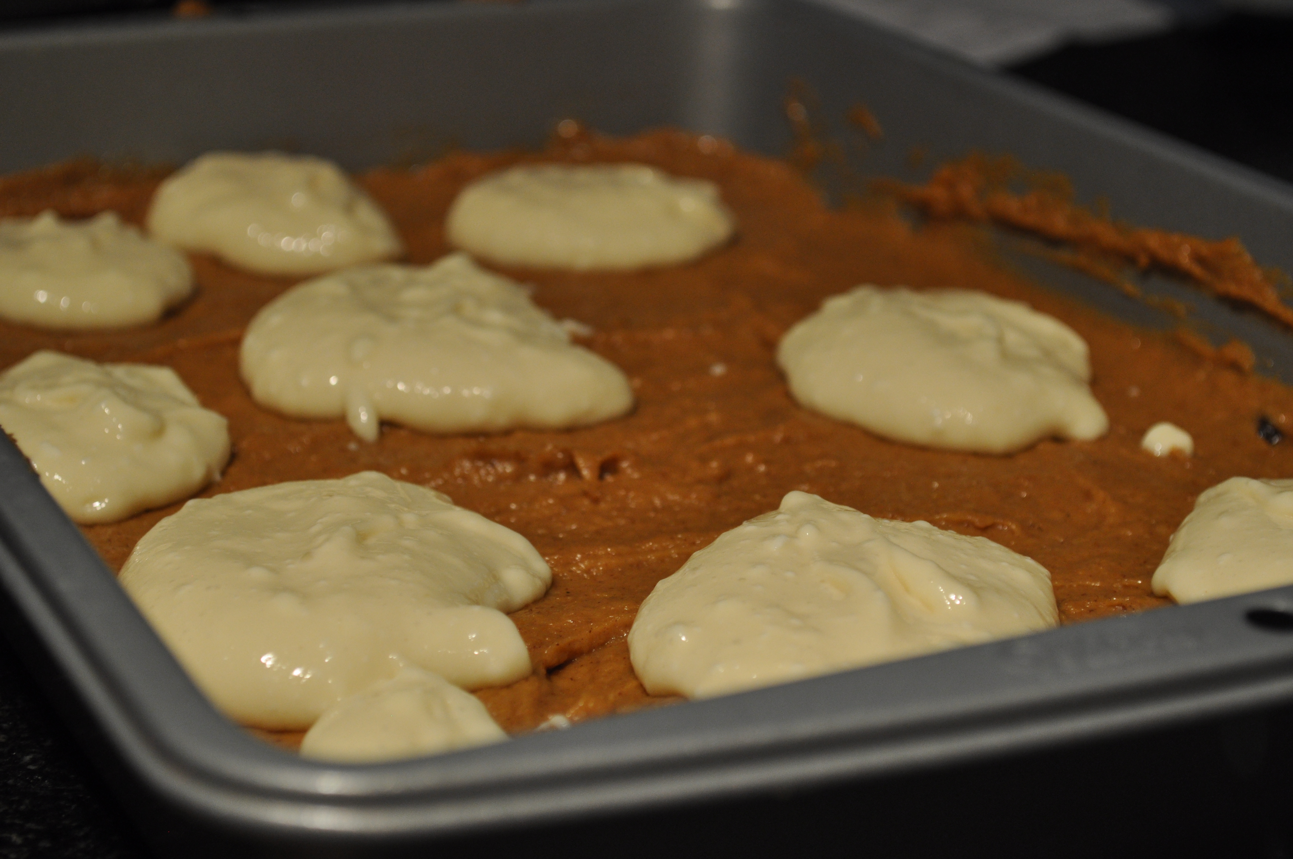 4. In a large bowl, whisk together the melted butter and both sugars until completely smooth and no lumps remain. Add the egg and vanilla and whisk to incorporate, making sure the egg has been completely mixed in. Add the pumpkin and again whisk to fully incorporate. Add the flour mixture to the batter and fold the mixtur until combined and no pockets of flour remain. Dollop with cheesecake topping and using a butter knife, swirl the cheesecake topping into the pumpkin blondie mixture.