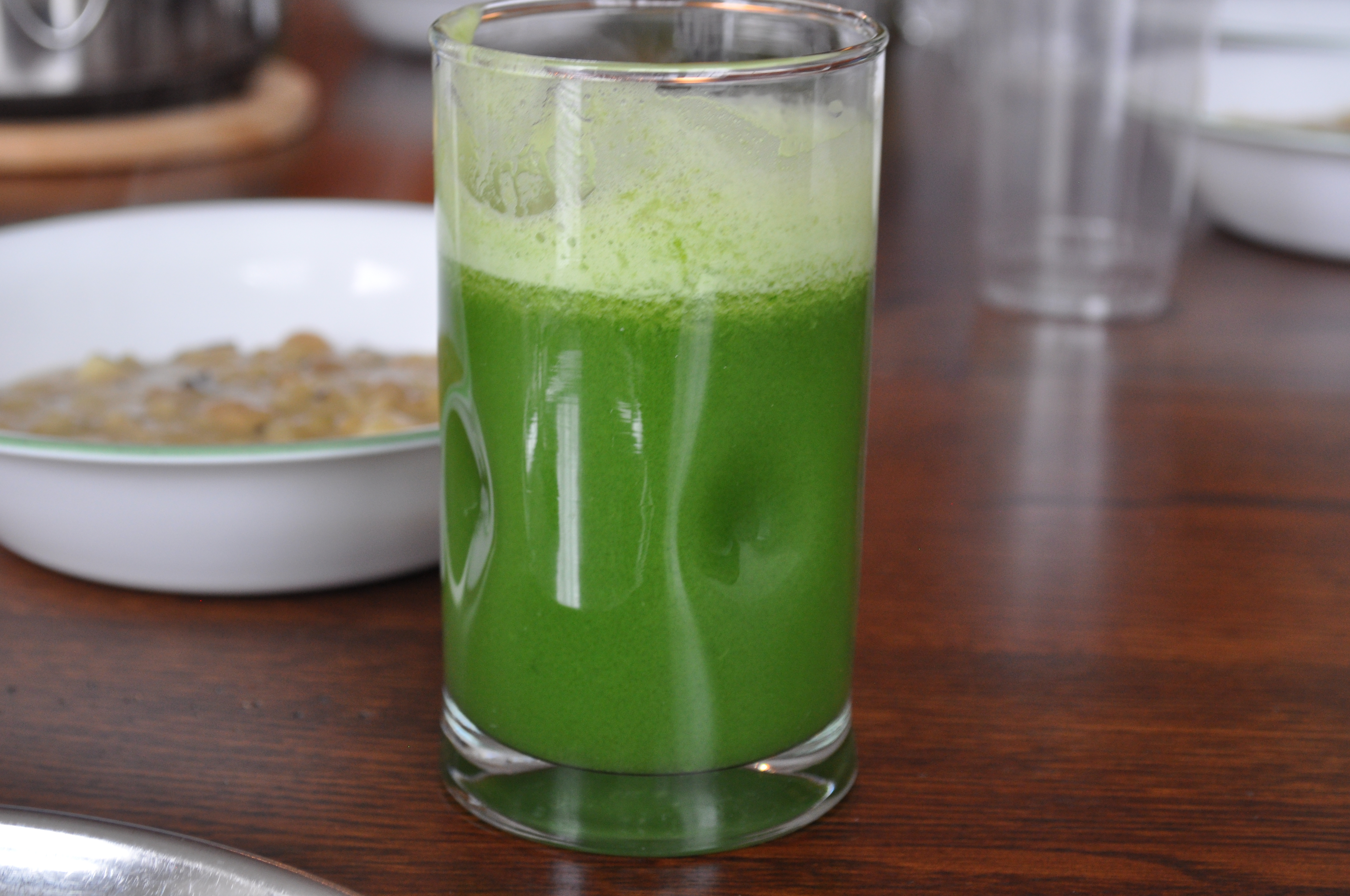 You’ll need a juicer to make this. Which I, actually, do not have. This lovely glass of juice was courtesy of my mom’s fabulous kitchen. But you can, as I have, blend all of these things (except the celery) in a heavy duty blender. There is just more prep work involved. You will have to peel the apples, and dice them small, and cut the leaves off the kale stalks. And you’ll have to juice the lemons into the blends first to give the leafy vegetables something to work with. And at the end, you’ll have to strain the whole thing to catch anything that did not liquify completely. But still completely yum!