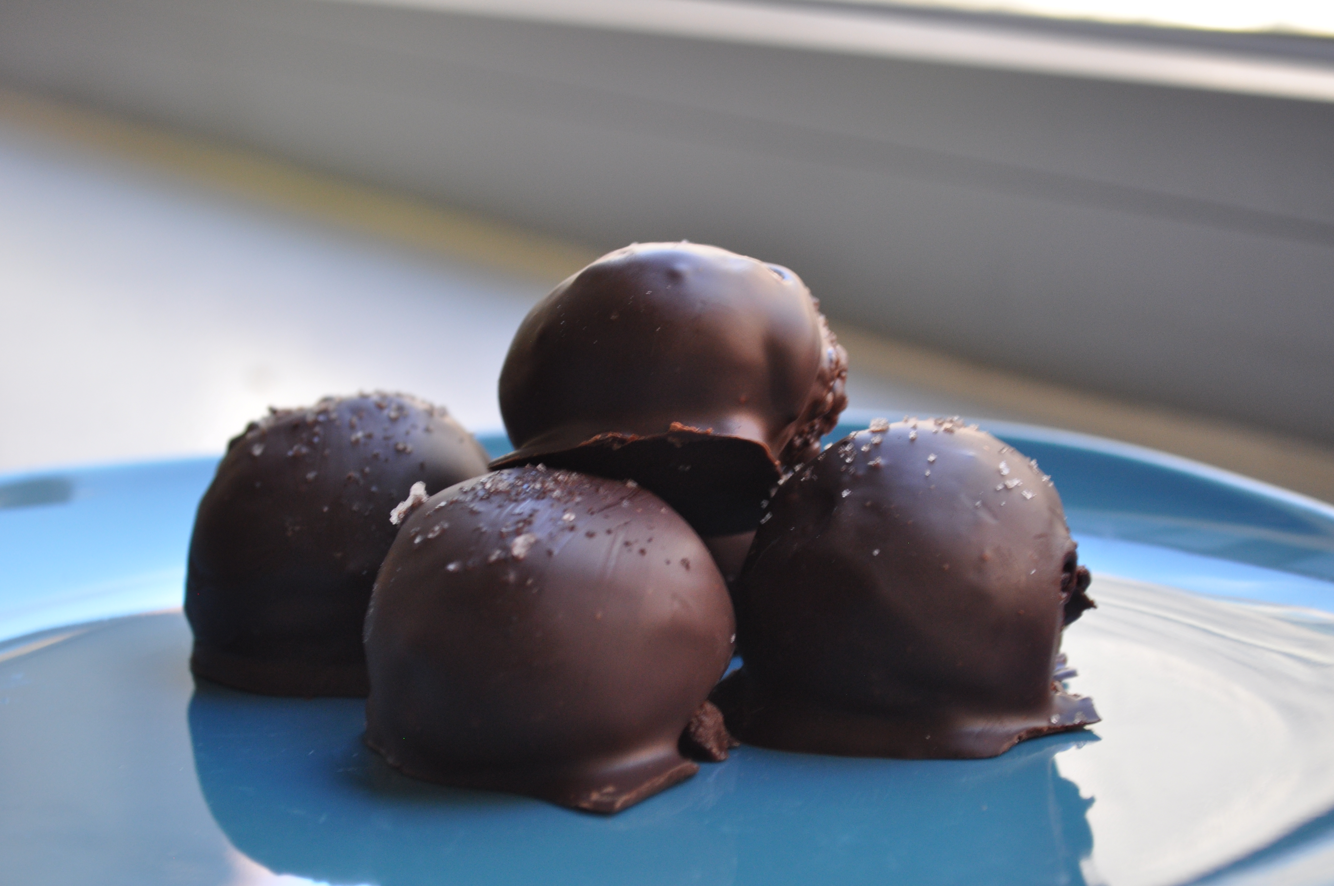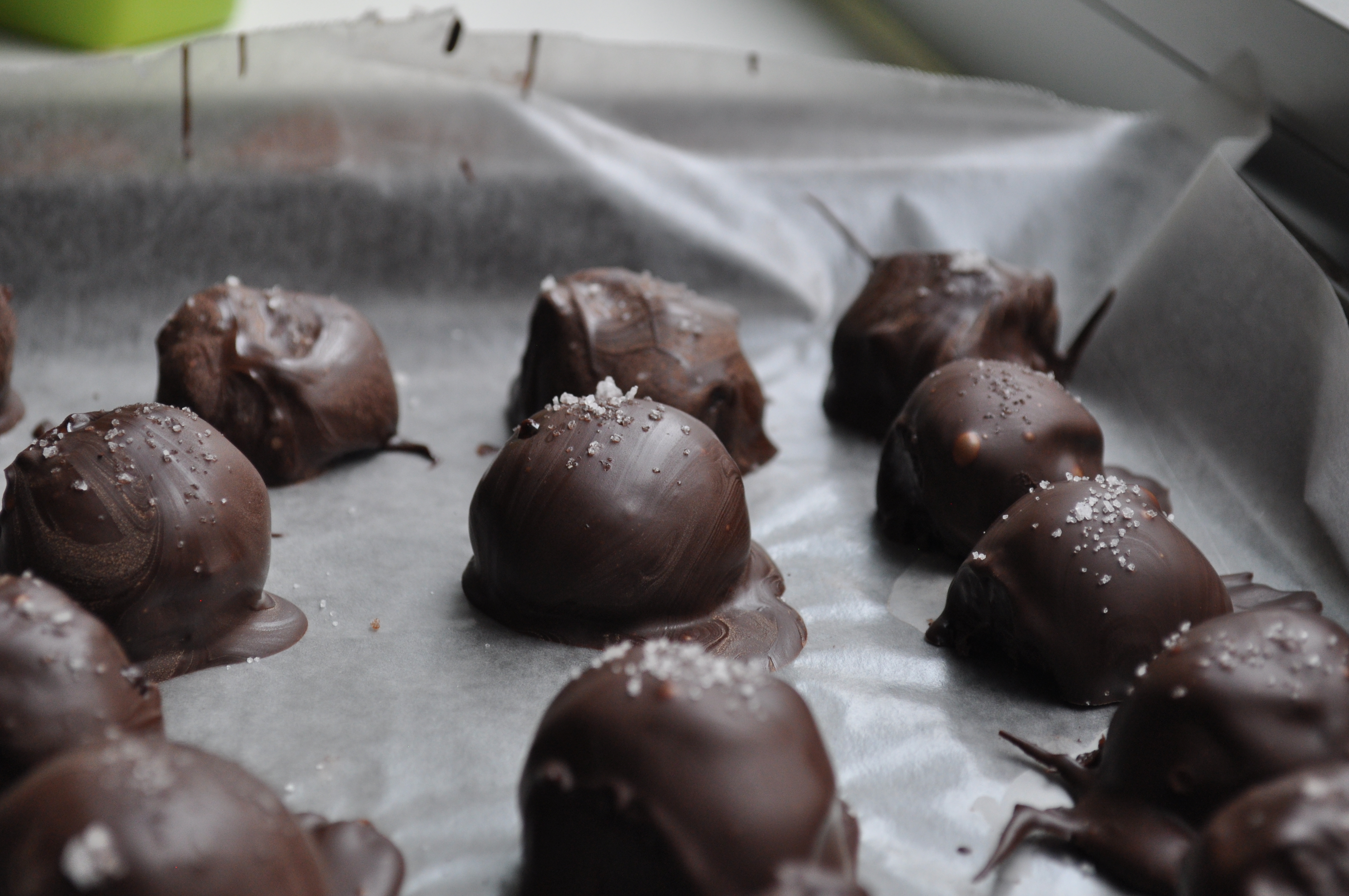 After dipping 5 truffles at a time, sprinkle a few grains of the remaining salt on top of each. Let the truffles set at room temperature.