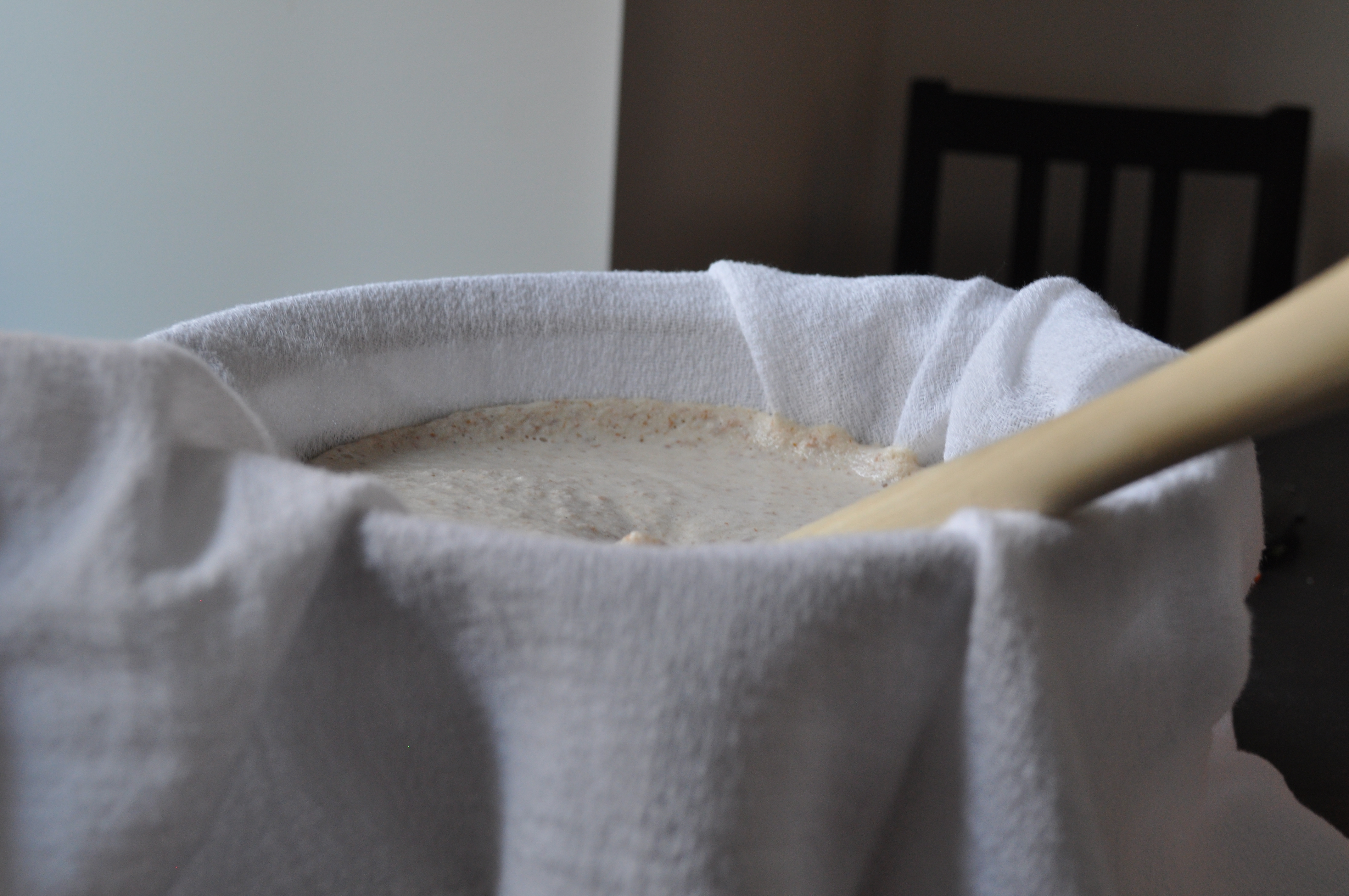 Strain the mixture over a strainer lined with cheese cloth or opened nut bag over a mixing bowl or measuring cup to catch the liquid. Press down with a rubber spatula to make sure that all of the liquid has been extracted.