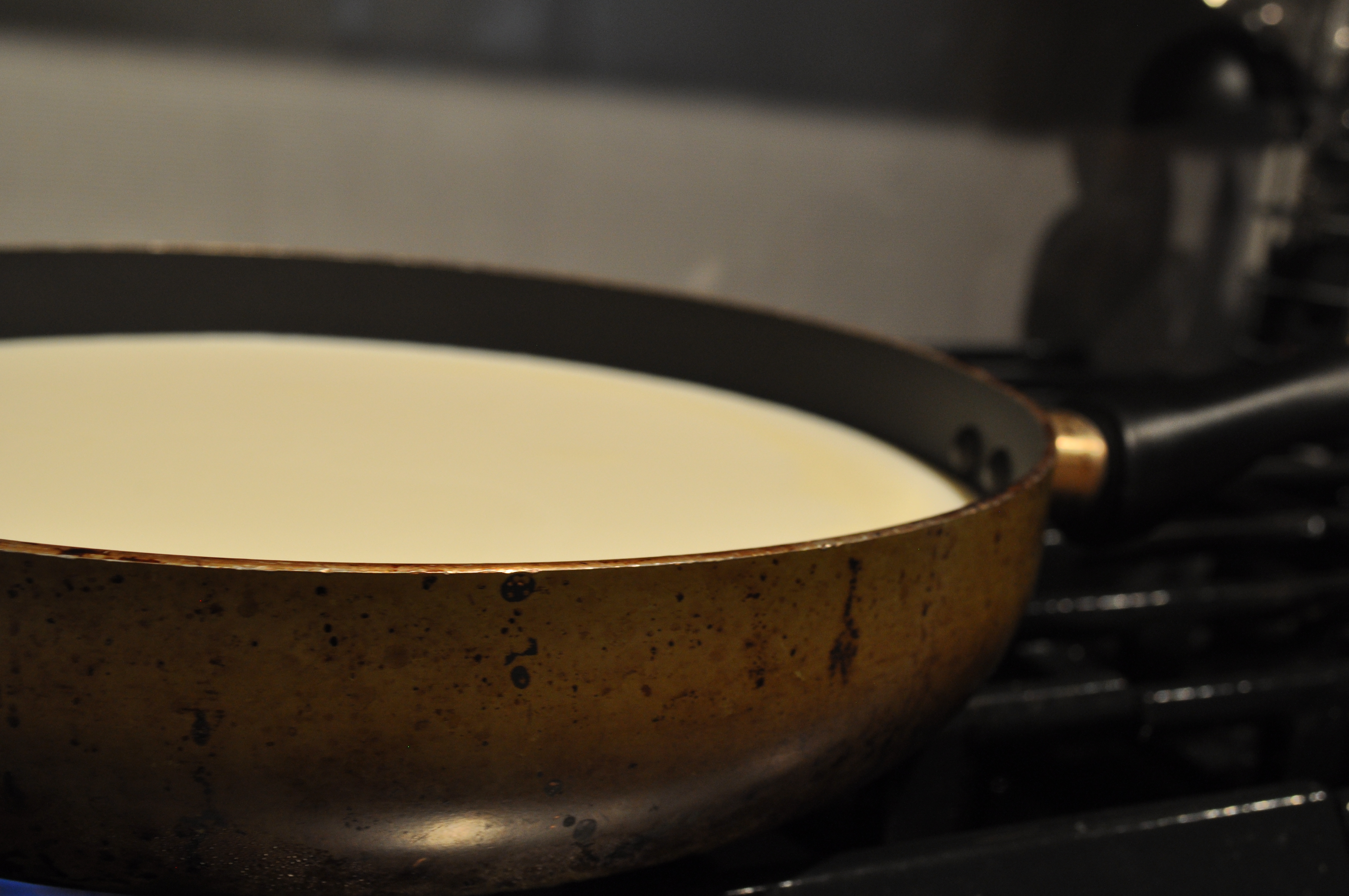 It will take about another half hour for the mixture to be really thick. Take the saffron, and heat it over a gas burner. This activates it. Add it to 2 tbsp. cream. Mix that into the milk/sugar mixture.