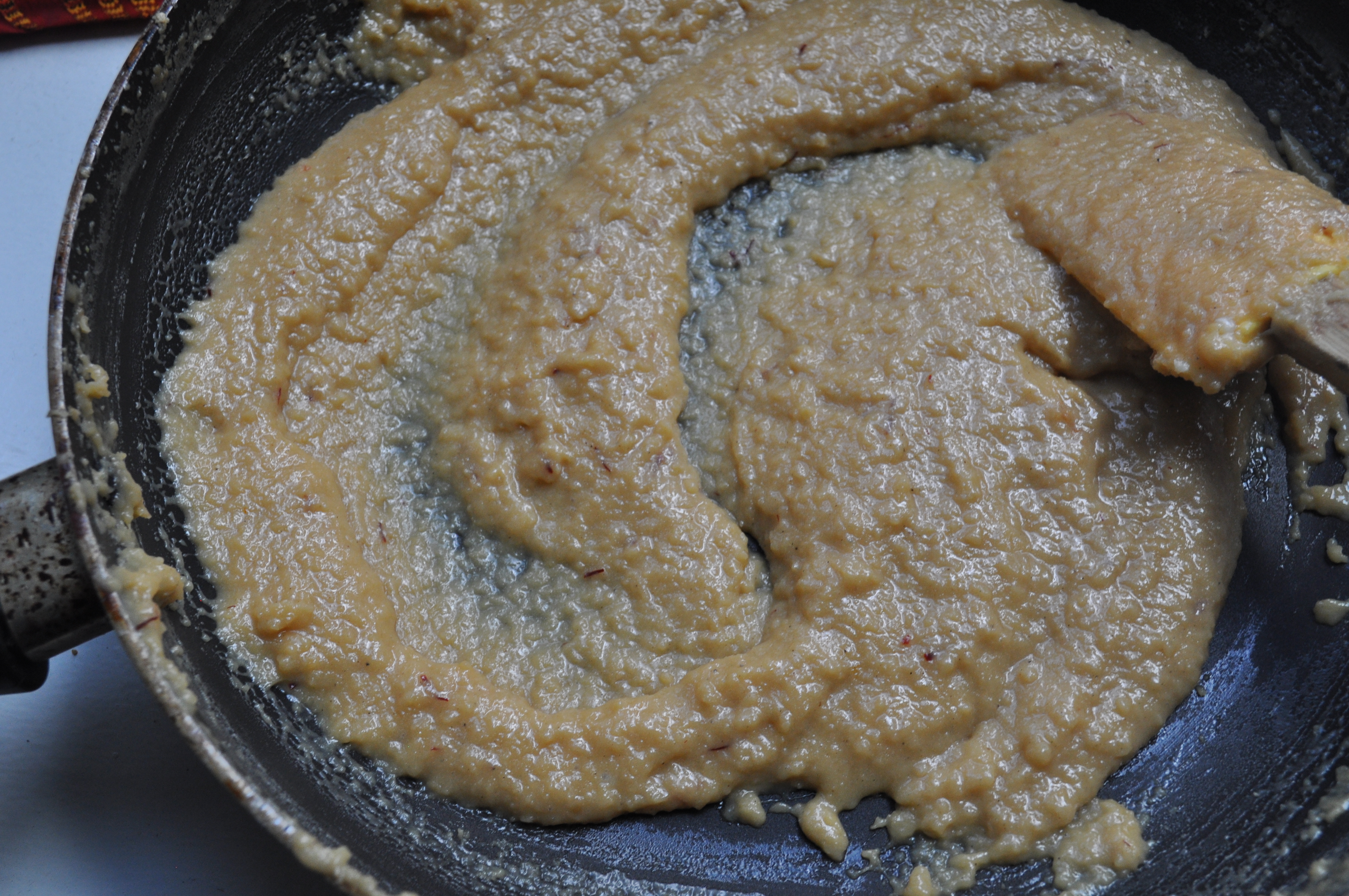 Milk solids will start forming at the 3 hour mark, at which point you will want to stir more often. When it’s very thick, but still has a little bit of liquid left to it, basically at the 3.5 hour mark, add the sugar and carefully stir it in. You will curse yourself for doing this, because sugar adds liquid, and you wll think that all of that time you spent to get rid of the liquid was all for naught. At this point, add the cardamom too. Stir it all together.